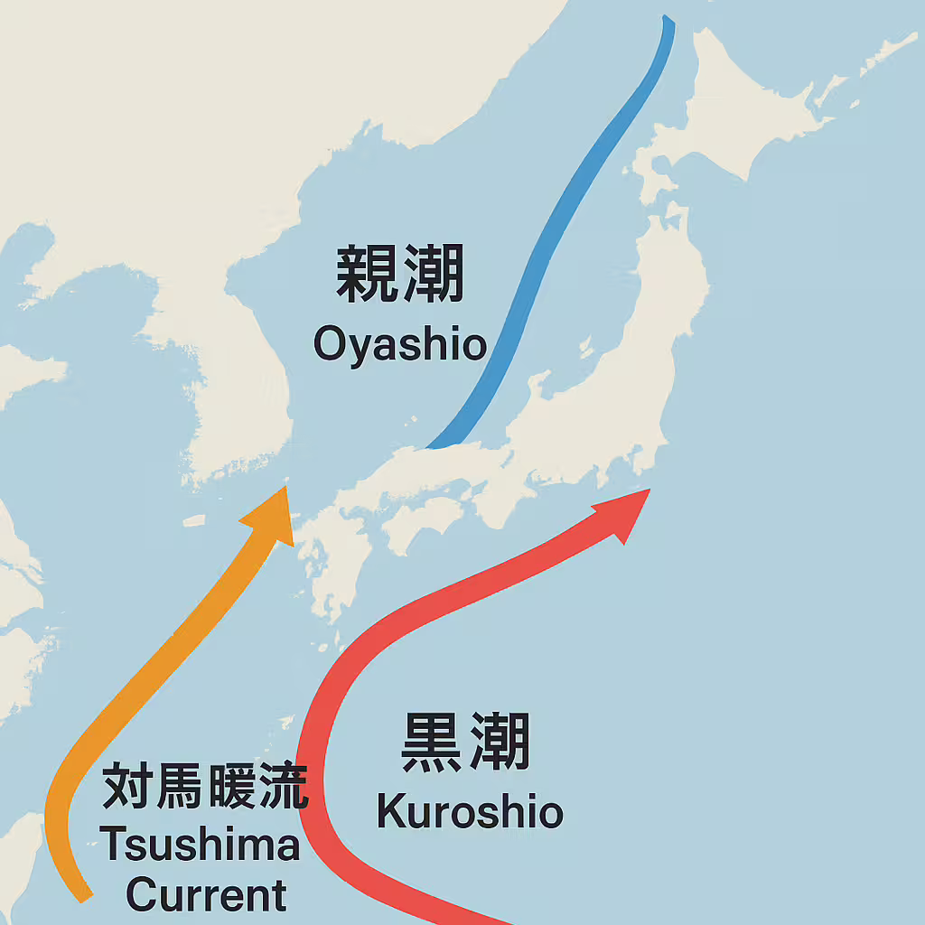 黒潮の一部が対馬海峡を通って日本海へ流れ込み、九州北部から山陰〜北陸〜北海道西岸へと北上する分流。日本海側の気候と漁業に大きく影響します。 - 🌊 親潮(北海道東沖)